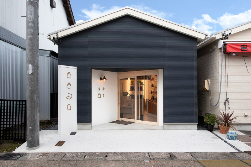 革製品専門のショップ。色とりどりの商品が映えるように、店内は白を基調としたシンプルな構成にした。